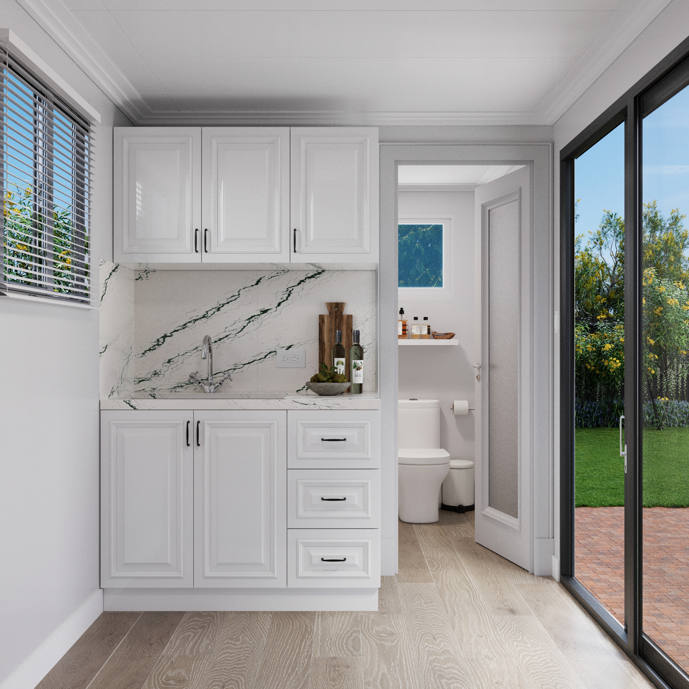 AS 2208 double-glazed windows, flyscreens, and French glass doors fill the space with light, creating a peaceful retreat for focus and fun.